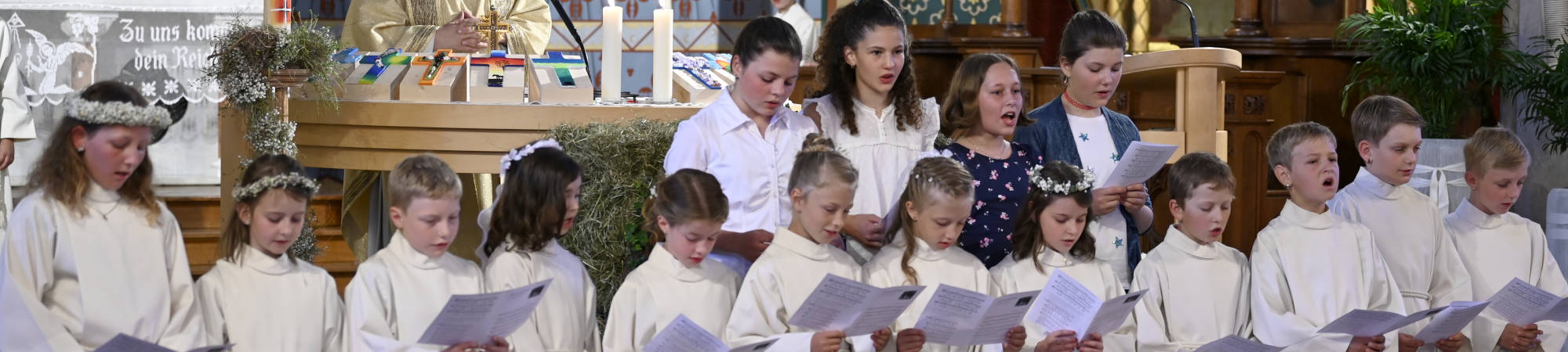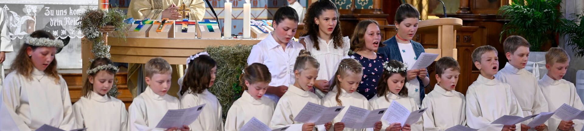 Die Erstkommunikantinnen und Kommunikanten von Haslen, Schlatt und Stein feierten den Gottesdienst mit Pfarrer Lukas Hidber in der festlich geschmückten Pfarrkirche in Haslen.