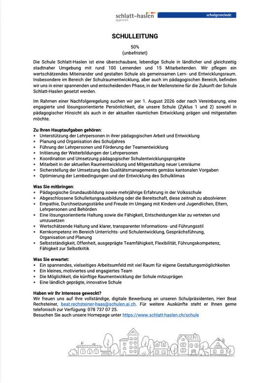 Die Schule Schlatt-Haslen sucht auf das Schuljahr 2026/2027 eine Schulleitung.