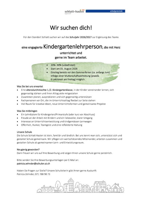 Die Schule Schlatt-Haslen sucht auf das Schuljahr 2026/2027 eine Kindergartenlehrperson.